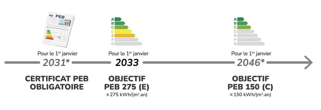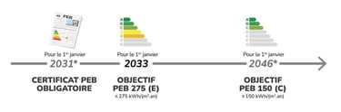 *Ces dates dépendent de l'entrée en vigueur d'un Arrêté du Gouvernement prévue le 1er janvier 2026 au plus tôt. Tous les logements devront alors disposer d'un certificat PEB pour le 1er janvier 2031 (5 ans après) et l'objectif PEB 150 devra être atteint pour le 1er janvier 2046 (20 ans après).