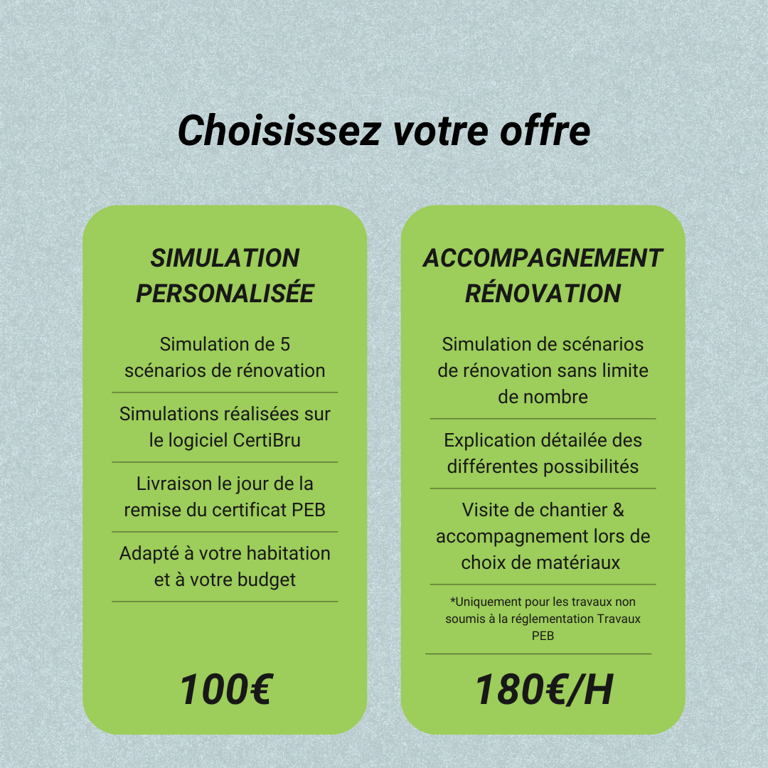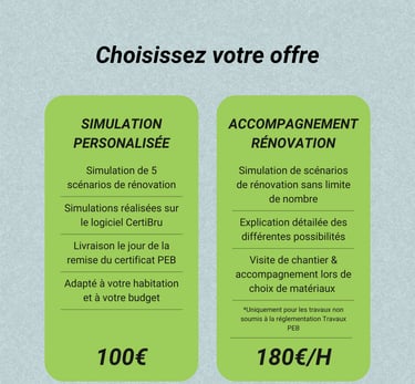 Offre Simulation Personnalisée : Nous réalisons une simulation sur mesure de votre score PEB en explorant jusqu'à 5 scénarios de rénovation énergétique. Cette offre vous permet d’évaluer les options les plus pertinentes pour améliorer votre performance énergétique. Elle est facturée à 100 euros TVAC.