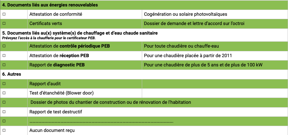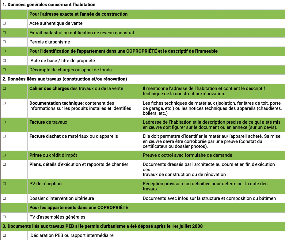 Le certificateur a l'obligation de visiter l'habitation pour y relever toutes les données influençant sa performance énergétique. Certaines caractéristiques techniques comme par exemple le rendement d’une chaudière, le type et l’épaisseur de l’isolant d’une paroi (façade, plancher, plafond ou toiture), la performance des châssis ne peuvent toutefois pas toujours être relevées visuellement. Le certificateur a donc besoin que vous lui remettiez des documents démontrant et décrivant les caractéristiques de votre habitation au plus tard lors de sa visite.